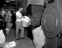 Bill Easton removing laundry from a drying machine at Easton's Laundromat, June 20, 1953 - 2003.2.63.1010