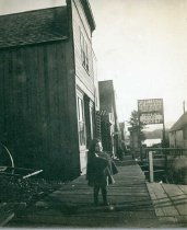 Child standing on Upper Front Street in front of Chop House sign - 75.6.10.44