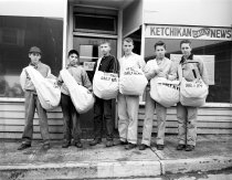 Six Ketchikan Daily News boys in front of the office on Dock Street, 1955 - 2003.2.63.1869