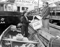 Pat Charles delivers newspapers to Beverly for delivery by boat, August 1953 - 2003.2.63.2032