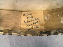 "Mystery Eagle" drum. by Ken Decker 18 inch painted, Northwest Coast - style drum The hoop is made from cedar wood, which has been glued up into a 18" hoop. The drum is covered with deer hide which has a red and black design painted on the front. The drum is signed on the front, as well as on the inside of the hoop. The text reads:" Mystery Eagle, by Ken Decker, Tsimshian- Wolf Clan". The rim is 2 ½" deep. |